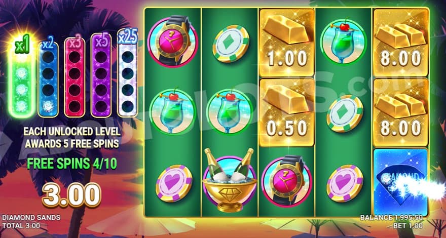 The Sunset Free Spins start with a multiplier of 1X. The feature has 5 levels, and the player advances to the next level by collecting 4 Sunset Diamonds on a meter to the left. Advancing to the next level awards 5 free spins, which means you can win a total of 20 extra spins within the feature. When the spins for the first level are finished, the game advances to the next level if you have collected enough Sunset Diamonds. The feature always finishes all spins on one level before moving on to the next, which means that you will have 10 spins on the first level and 5 on each following level.