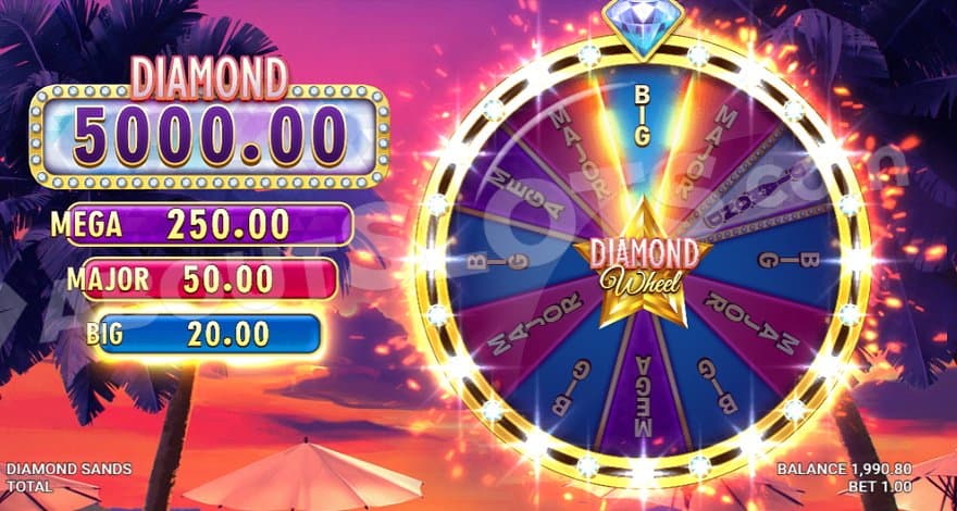 Diamond Sands from Just For The Win is a luxurious casino slot with both a free spins feature and a bonus wheel awarding up to 5000X the bet.