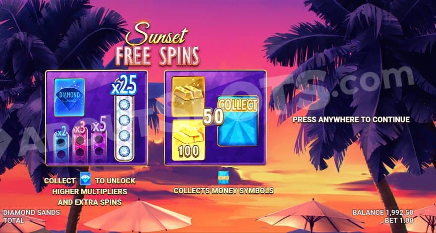 The Sunset Diamond Symbol only appears in the free spins. The player will collect diamonds to advance on a multiplier meter.