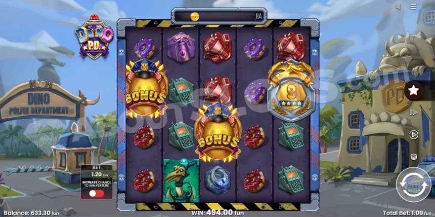 The lower-paying symbols consist of donuts in various colors. A full line of 5 with one of these pays 3x the bet. The medium-paying symbols are locks, radios, flasks of gas, and megaphones, paying 7.5x-10x the bet for a full line of 5. The higher-paying symbols include three dinosaurs. Five-of-a-kind with these pays 30x-50x the bet. Wild symbols and Scatters are also available, with the former substituting for other symbols and the latter activating the bonus game. Lastly, Coin symbols can land on the reels, but we’ll go over these in the next section.