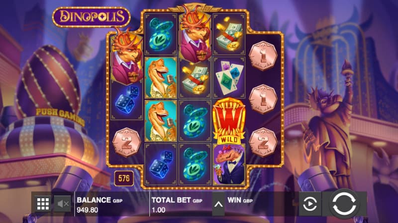 In this new casino slot from Push Gaming, we get to take part in a spectacular gaming experience. We have ended up in a parallel universe where most things are the same, but there is one big difference. It is a world where dinosaurs are still alive and living in the same style as us humans. Just like you say, great minds think alike, these dinosaurs also think that a casino city like Las Vegas must exist. At the place we visit, we quickly find out that slots are something that is close to the hearts of dinosaurs and they are imprisoned in front of its various screens. Everyone is very stately dressed with luxurious accessories and clothes that really catch your attention, so the tailor really deserve big cred for his sense of design but above all his sense of being able to tailor all of these for dinosaurs.