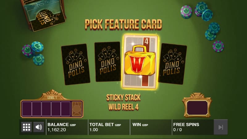 Just like in the Base game, you can take part in Dino Coins by having at least 2 wild symbols connected to it and when that happens, the Dino Coin will be gathered to create a win. If you land Dino Coins with dots, these will start to fill up a meter on the right. Once you manage to fill this meter with 5 coins, you will reach level 2 and then another 5 coins are required to get to level 3, 4 and finally level 5 which is the highest level. Each time you reach a new level, you will get to choose 1 card from 4 face-downed cards that give Feature Picks Prizes and then 1 card from 4 face-downed cards that give extra free spins.