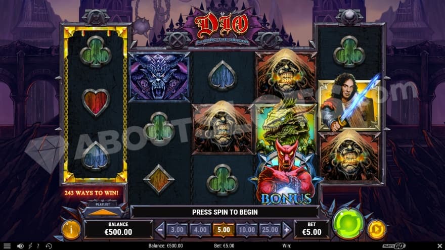 The game design is themed around the rock legend Ronnie James Dio, where we are on a quest to kill the dragon. In the background of the reels, you can see a big castle where the dragon is staying. You can play this slot on the devices notepads, desktops and mobiles. You create a winning combination by landing 3 or more of the same symbol type on adjacent reels starting at the far left.