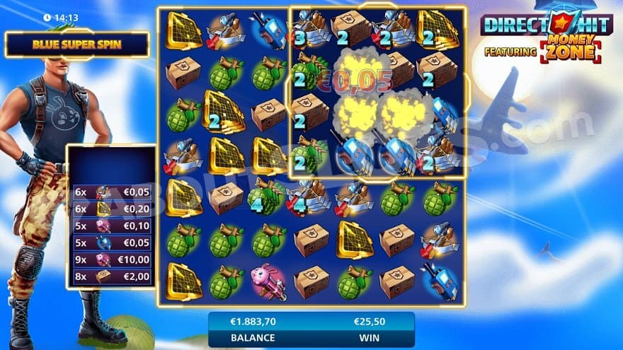 This is a pretty cute game. Although it has a war theme, it looks more like the cartoon Inspector Gadget than a first-person shooter computer game like Counter-Strike. If you want to play a slot containing weapons and explosions but think games like El Patron are too close to reality, then this is just for you. Don’t worry about having nightmares after playing Direct Hit! The graphics work pretty well, and the soldier next to the reels contributes to the playing experience. Cascading wins are appreciated; just be aware that the outcome from several wins can be low since some combinations only pay 0.05X the bet. On the other hand, you can land pretty nice wins straight away when 10 or more of the same symbols are connected.