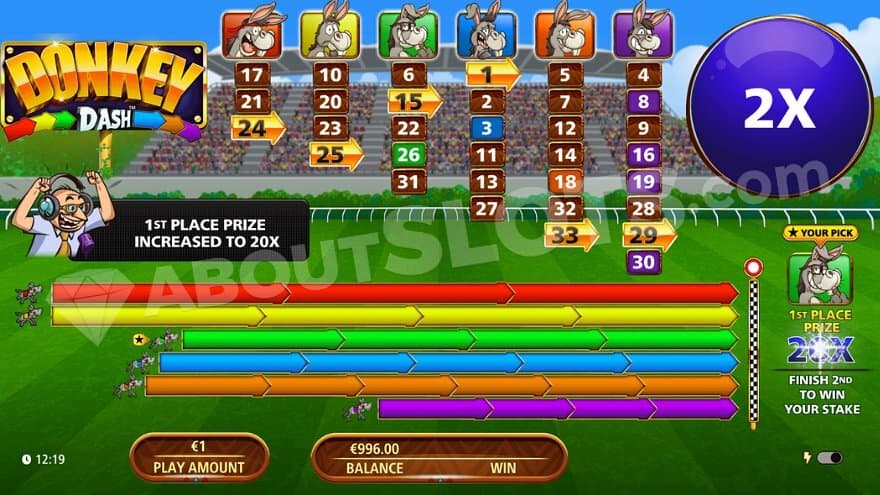 While starting the game, the player gets to choose one of the six donkeys on a pick screen. You can also change your bet, between 0.50 and 30. Every donkey has between 3 and 8 arrows going horizontally between them and the finish line. The lowest-paying donkey is the red one, doubling the bet in case of a win. He has only 3 arrows between him and the finish line. The best-paying runner in this competition is the purple donkey who has 8 arrows between him and the finish line. If you manage to race him first to the finish line, you’re awarded 100X the bet. Ending up in second place will give you 1X the bet, no matter what donkey you’re racing, and positions 3-6 don’t pay anything. This is how much each donkey pays for winning the race and how many arrows they have: