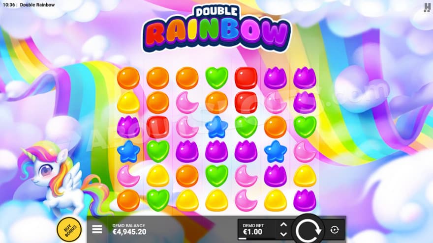 The design of the game is a rainbow theme, where we are high up among the clouds and double rainbows. In the background of the reels, you can see white clouds surrounded by colorful rainbows, where you can also see a unicorn. You can play this slot on all the devices notepads, mobiles and desktops. You create a winning combination by landing 5 or more of the same symbol type in the cluster, which then results in the winning symbols disappearing and new ones then dropping down to cover the empty positions. This cascade feature continues as long as new wins are created.