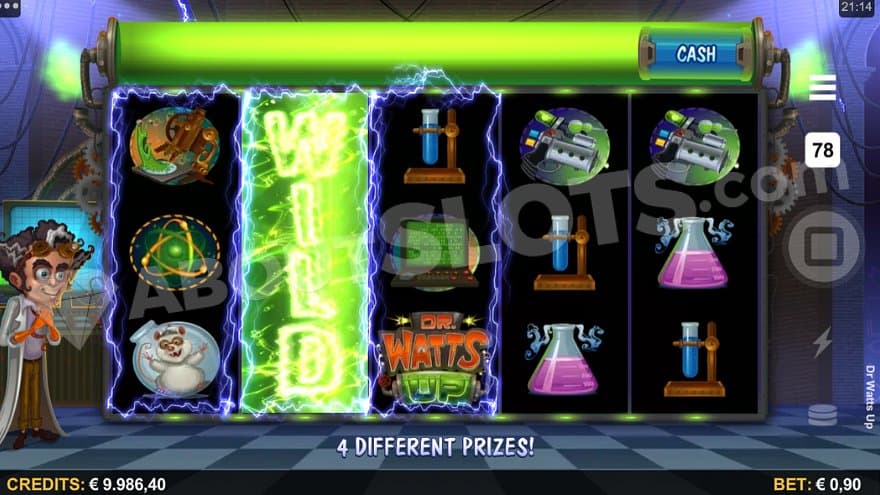 Dr. Watts is standing to the left on the screen, wearing a long white robe over his other clothes. He has a large head and big staring eyes. His gray hair points in all directions while he's watching the reels. They are black and have research instruments and animals on them. On top of the reels is a green bar where 4 different feature containers can appear over each reel. The 5x3 grid has 9 paylines, and you need to land at least 3 of the same symbols on a payline to make a win. All wins must start on the first reel to the left, and the game is available on mobile phones and other devices.