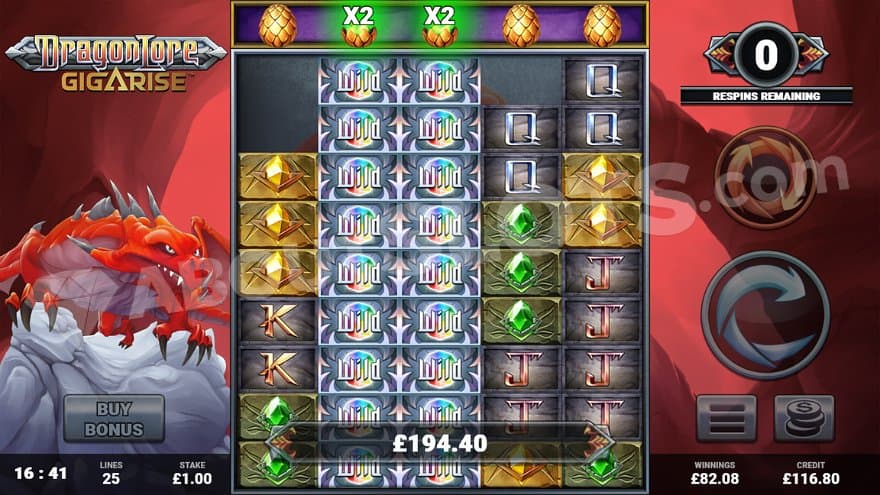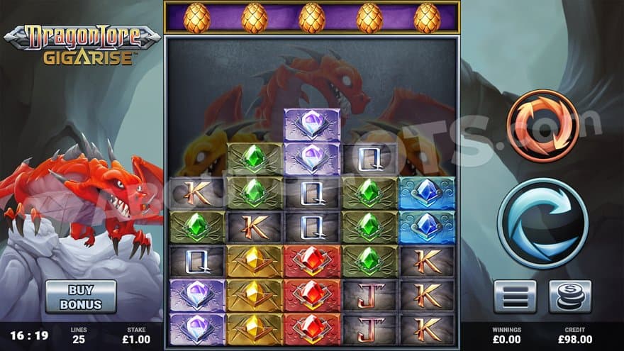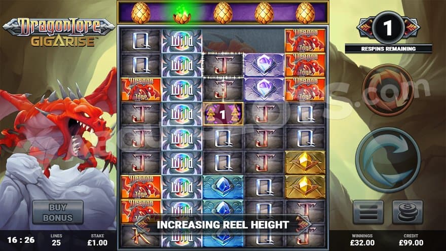 The Gigarise Symbol is a dragon egg. Each egg randomly raises the reel it lands on by 1, 2, or 3 rows, to a maximum of 9 rows. Landing an egg on a reel that already has 9 rows will trigger the Super Wild Respins.