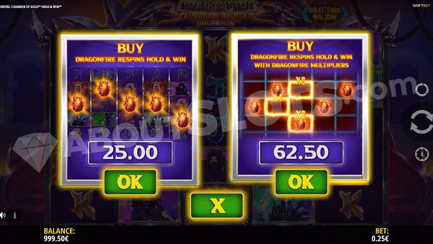 You can purchase the Hold&Win Respins for 100X the bet. You can also pay 250X the bet to trigger the feature with the Dragonfire Multipliers from the start.