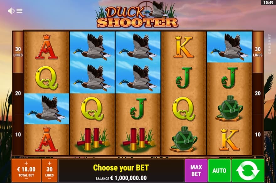Duck Shooter is a video slot from Gamomat that features 5 reels and 4 rows. During the spins you can choose to activate 10, 20 or 30 paylines, resulting in varying sizes of the bet size. One can choose between making a Min.bet of 0.10 and a Max.bet of 18. The RTP is around the average, where in this slot we have an RTP of 96.09%. Duck Shooter has a medium volatility, where the lucky player can win up to 550X the bet.