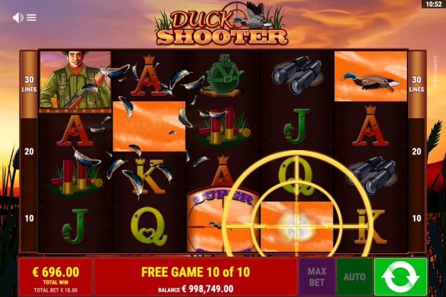 The bonus symbols consist of the duck symbols, where you can take advantage of these by landing a hunter symbol at the same time as one or more bonus symbols on the reels. The hunter will then shoot at all the bonus symbols and pick up their respective prize. There are two different bonus symbols, namely the normal bonus symbol and the super shot bonus symbol, where their values are 5X and 50X the bet respectively.