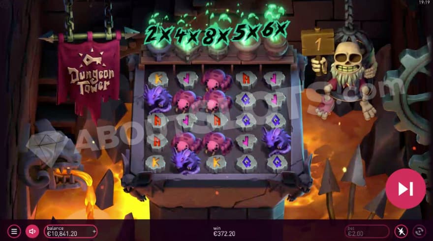 Dungeon Tower takes place in a spooky dungeon with chains and spider webs, creating a haunting feeling. When you trigger the free spins, a cool animation starts where you descend deeper into the tower. It gives a change of scenery, which is really underrated and underused in the iGaming industry. The setting is completed with spooky but also funky music. However, its funkiness takes away from what otherwise could’ve been a more thrilling and haunting atmosphere. You can play this game on all common mobile devices and desktops. A winning combination is created by connecting 3 matching symbols vertically or horizontally, and since the game uses grid pays, it doesn’t have to be in a specific line or from left to right.