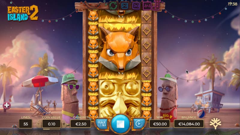 Easter Island 2 is a slot that has 6 reels and 4 to 8 rows. As a result, it can be between 25 paylines to 55 paylines during the spins. Together with the Moai duo, we really get to take part in festive spins that provide an incredibly entertaining moment in front of the screen. You can win up to 2500X the bet and this is made possible through the exciting features that this slot has. These features are Colossal Blocks, Wild symbols, Symbol Swap respin and Expanding reels. The more symbols of the same type that your winning combination contains, the more likely your chances of winning big will be. Pack a towel and sunglasses, because it's time to travel to the Venice beach and meet the Moai duo.
