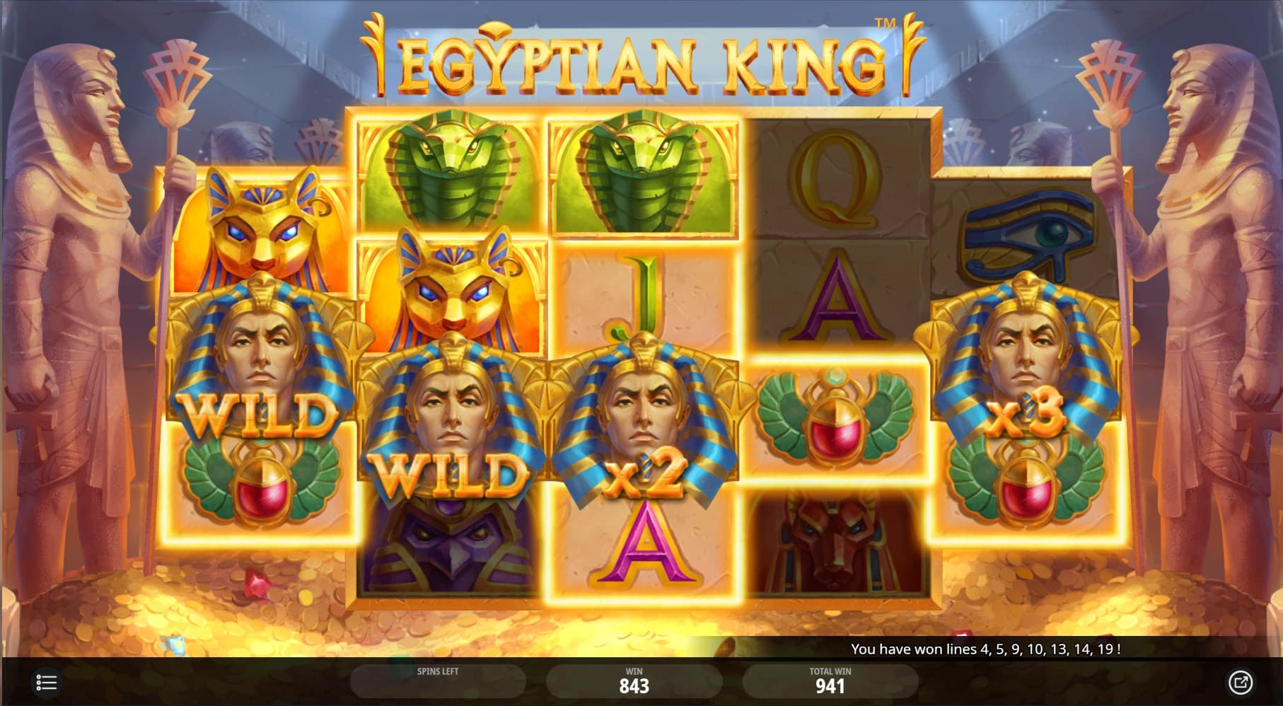 Three years later in 1925, the team finally managed to find their way into the chamber which contained three coffins with the Tutankhamen's golden mask alongside other artifacts. In the Egyptian King slot, players take the role of a fortune-seeker who hop on a remarkable journey which leads to these chambers. All of the spinning actions offered in the game take place here while the game’s reels are guarded by two remarkable stone statuses located on both the left and right sides of the reels.
