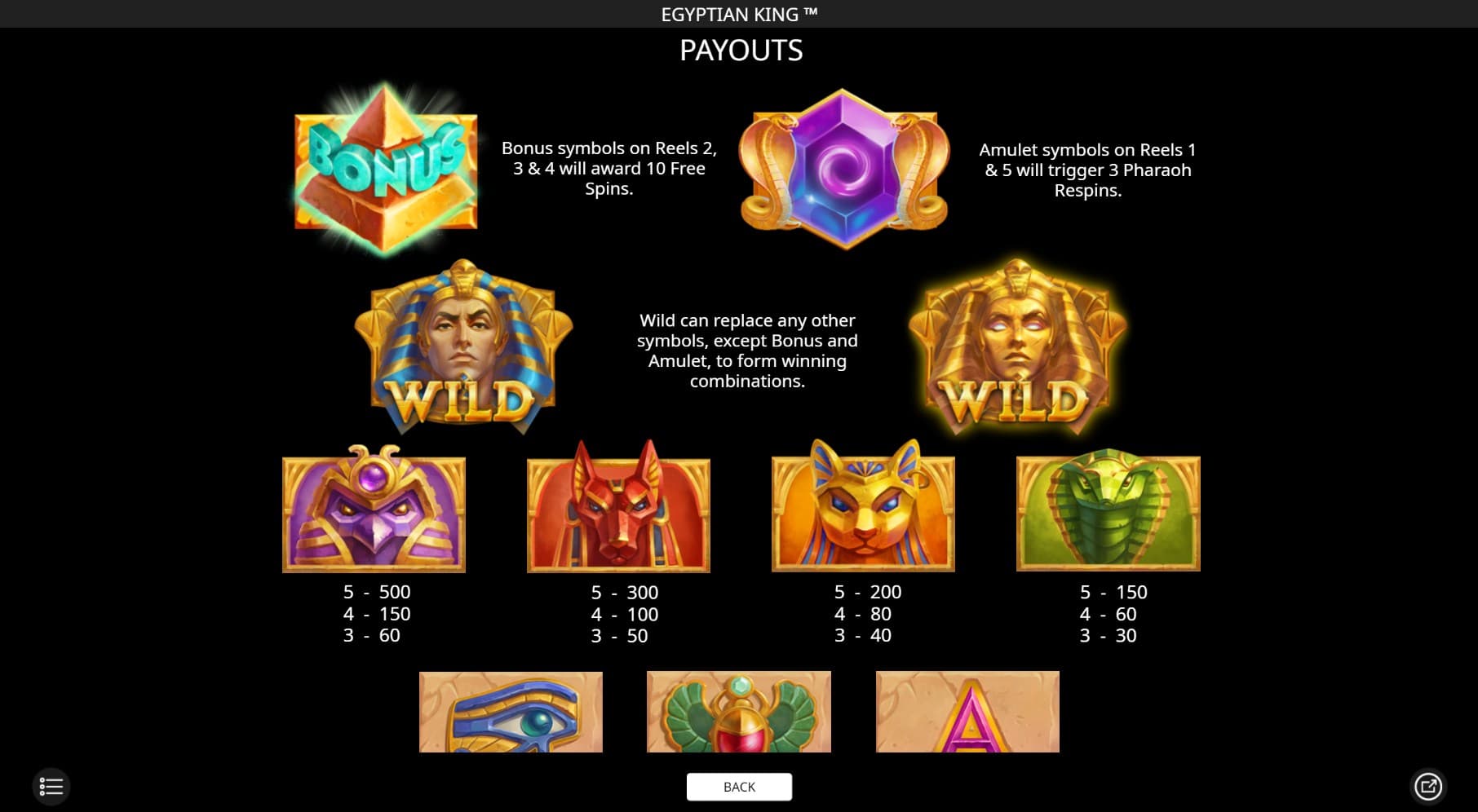 As already mentioned, the Egyptian King slot features a great variety of bonus features which surely keep players entertained. First of all, there is the game’s Random Wilds bonus mode which adds three or more extra wilds to the reels randomly during the base game. Then, there is the Egyptian King Pharaohs Respins bonus that comes into play when players land bonus amulet symbols on the first and last reel on the same spin.