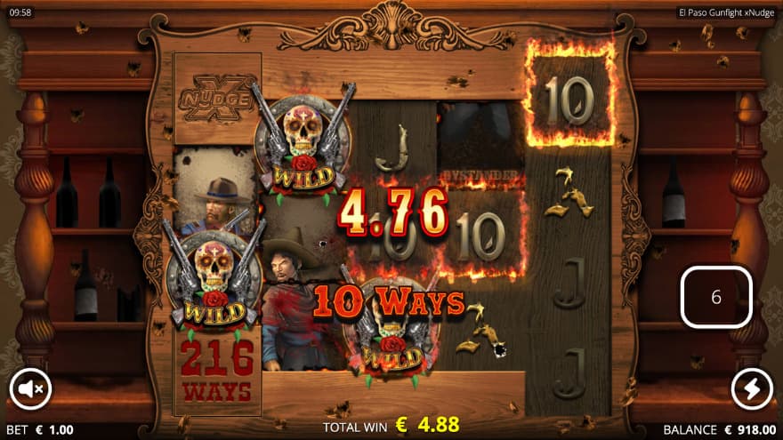 The game's design takes place in the city of El Paso, Texas, the place that was notorious for its grand gunfights that took place there. In the background of the game, you can see shelves with a few bottles, where its salon environment truly creates a real western feeling. The game's reels are surrounded by a beautifully carved wooden frame with nice patterns.
