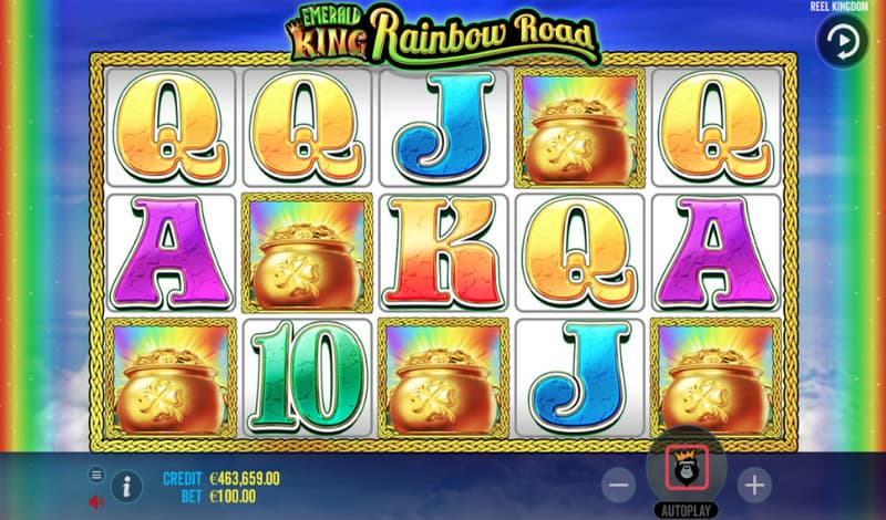 In this colorful paradise a lot of exciting features and symbols awaits. The lower paying symbols are 10, J, Q, K and A. The symbol showing the Emerald King Rainbow Road logo is the highest paying symbol. The wild symbol consists of a four-leaf clover with the text wild on it. Here you can also take part in two different scatter symbols, one shows a picture of the Emerald King and it is the game's Rainbow Road scatter. The other shows a picture of a pot of gold and it is the game's Eliminator scatter. If you manage to activate the game's Emerald King mini slots bonus, you can take part in symbols that show number seven in the colors blue, yellow and red as well. Already here we begin to understand that with all these different symbols, something really good must be able to appear during the spins that are made.