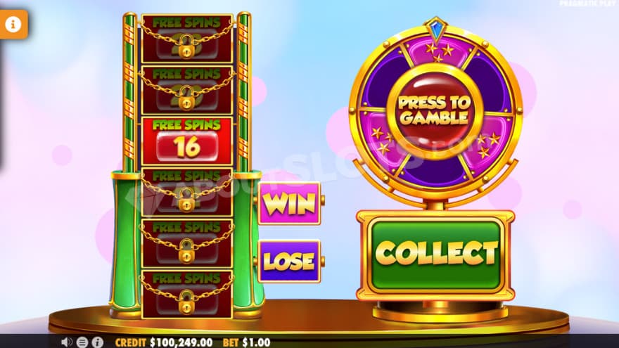 If you have obtained between 12 to 20 free spins, you can choose to gamble for more free spins. If you choose to gamble for more free spins, you will spin a wheel and if you land in the correct position, you will be moved up one step on a meter and if you land in the wrong position, you will be moved down one step. You can win up to 28 free spins and if you land on the wrong position when you have 8 free spins, the round will end immediately. You have the following chances of succeeding with your gamble depending on the number of free spins: