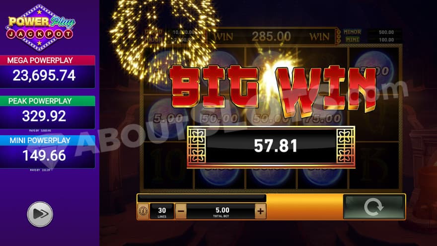 This progressive Jackpot includes the Mega, Peak, and Mini Powerplay Jackpot, which can be won on any random spin during the Base Game. The current value of the respective Jackpot is displayed to the left of the reels.