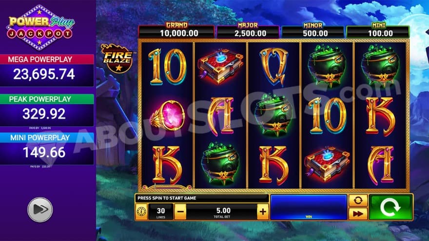 The game’s design is based on a wizard theme, and you can see the wizard’s house located to the left of the reels, isolated in the forest. Wizards are fictional magic practitioners inspired by druids who were members of the high-ranking priestly class in ancient Celtic cultures. The druids are described as men of philosophy and morality and were responsible for organizing worship in the British and Irish societies from the 4th century BC to the 2nd century. The left side of the screen is dedicated to the Power Play Jackpot with Mega, Peak, and Mini Powerplay Jackpots. In terms of the reels, they are positioned slightly to the right, with 4 Cash Prizes above them. All remaining buttons, including the Spin and Bet Size buttons, are positioned below the reels. You can play Fire Blaze: Blue Wizard Powerplay Jackpot on all mobile devices, desktops, and notepads. You create a winning combination by landing 3 or more of the same symbol types on adjacent reels starting at the leftmost reel.