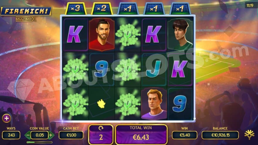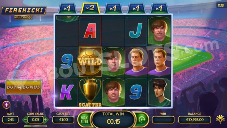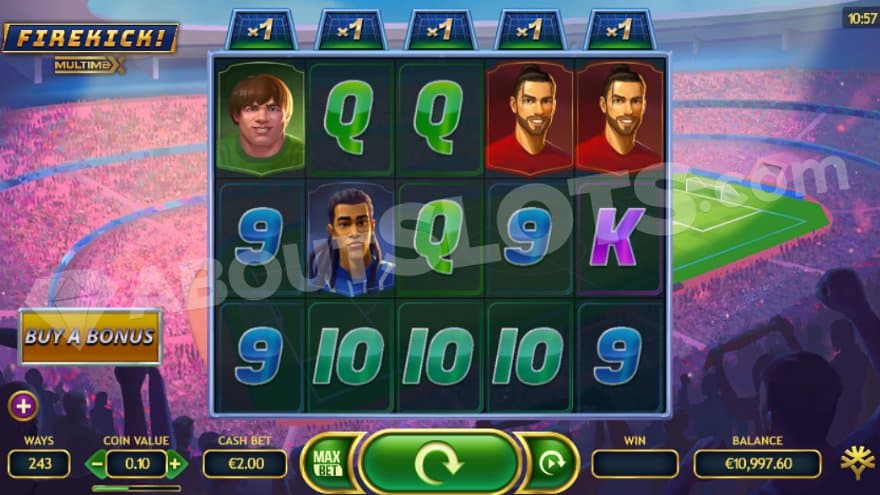Firekick! Multimax takes place in a huge football stadium with three levels. Some sunlight comes in through the open roof, and the stands are full of cheering people. Part of the pitch is visible, but the reels cover the main part. The spins are not only accompanied by cheering people but also a fast, techno-sounding tune. On top of each reel is a 1X multiplier that can grow by landing wilds on cascading wins. To make a win, the player has to land at least 3 of the same symbols on adjacent reels, going left to right. All wins must start on the first reel to the left, and the game is available on all sorts of devices, such as mobile phones, notepads, and desktop computers.