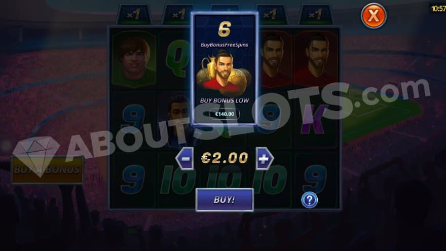 Before the free spins start, the player can shoot penalties to win extra spins. It’s a risky gamble since you can lose all your spins. Each successful penalty gives the player an extra spin, and losing a penalty means that all spins are lost. The Free Spins Gamble is optional; you can always start the free spins at any time. You can gamble for free spins until you have reached the max number of 11 spins, and the free spins will automatically start.
