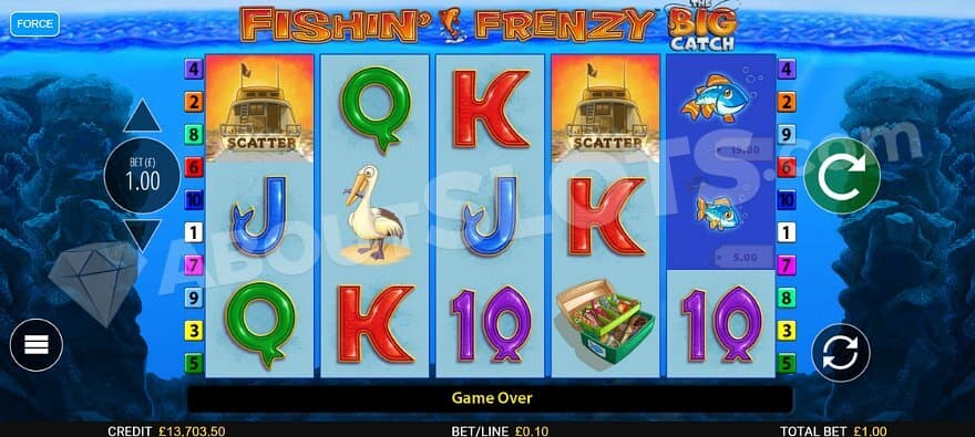 A fishing boat is the Scatter Symbol of the fishing adventure. Landing 3 scatter symbols anywhere on the reels awards the player 10 free spins. Landing 4 scatters awards 15 free spins, and 5 scatters will give the player 20 free spins. The scatter symbols cannot appear in the free spins feature.