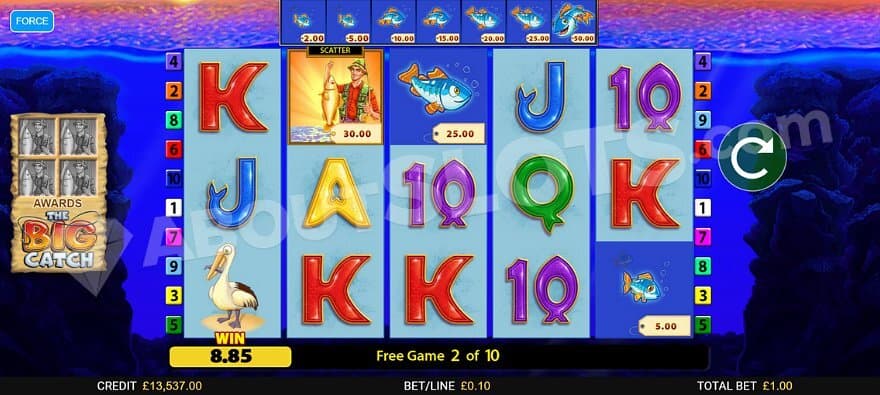 Landing at least 3 scatter symbols takes you here. The spins work like the regular spins except that the fisherman reels in the cash prizes for all present fish symbols whenever he hits the grid. Every fish has a cash prize between 2X and 50X.