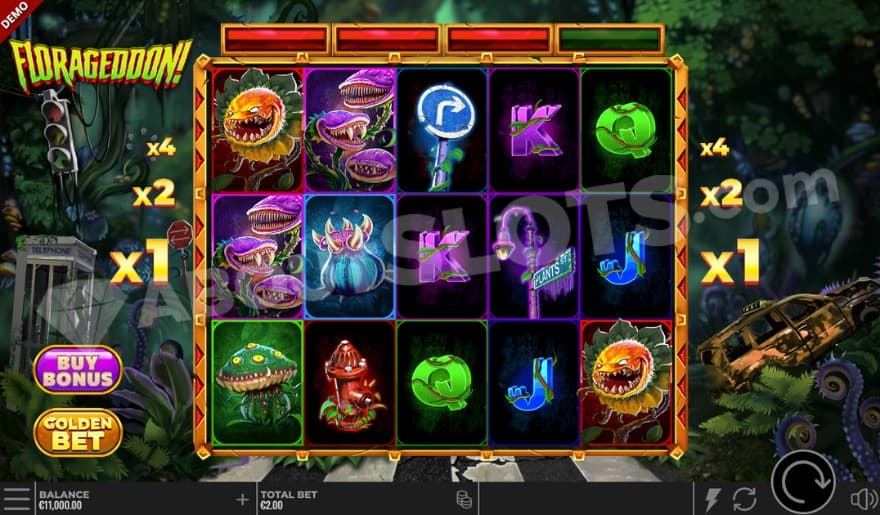 The game's design depicts an apocalyptic place where carnivorous plants are conquering the earth. In the background of the reels, you can see how the lush forest slowly devours a car and a phone booth. You can play this slot on all the devices notepads, mobiles and desktops. You create a winning combination by landing 3 or more of the same symbol type starting either leftmost or rightmost, as the pay both ways mechanic applies.