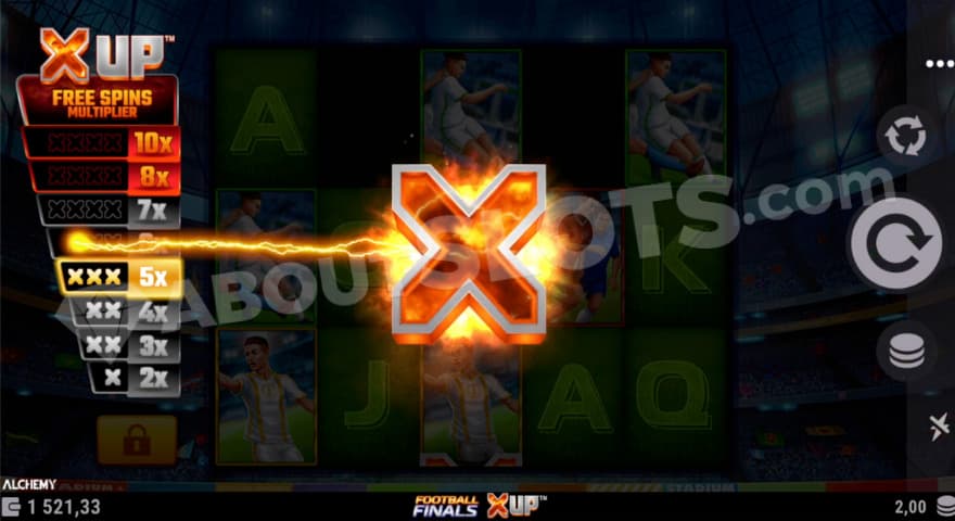 The lower-paying symbols are made up of 10, J, Q, K, and A. Five-of-a-kind with these will pay 1x-1.5x the bet. The higher-paying symbols embrace the theme, including footballs, players, and supporters. A full line of 5 with one of these pays 2x-4x the bet. A golden trophy, closely resembling the one given to the winners of the World Cup, acts as the Wild symbol. The X UP symbol is the key to unlocking the Free Spins feature, making it this game’s Scatter symbol. Now, let’s take a look at the features!