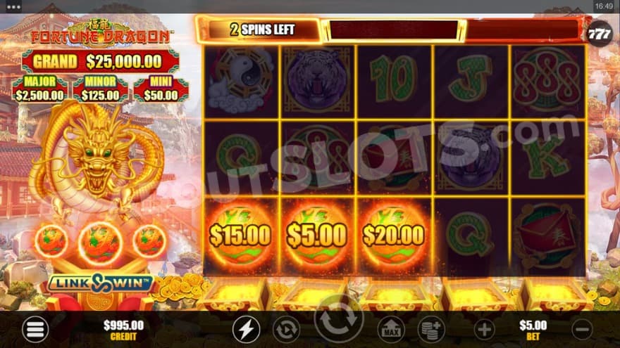 The game takes at what appears to be some sort of East Asian palace. Perhaps China, considering the dragon that’s present. Chinese dragons are benevolent symbols in Chinese culture, and opposite to being evil and dangerous, like we in the west believe, they are seen as lucky and good. When in Rome, do as the Romans do, or when in China, do as the Chinese do, and consider this dragon your friend. He is, after all, a fortune dragon; perhaps he’ll share. As pretty much all Chinese-themed games do, a traditional tune plays in the background as you spin your way to fortune.