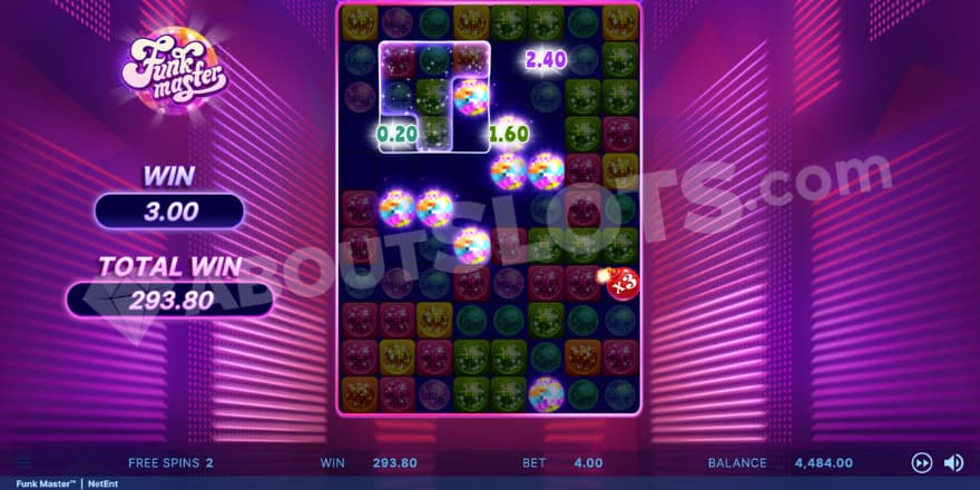 Funk Master is a video slot from NetEnt that has 8 reels and 8-12 rows. You create a winning combination by landing a cluster of 6 or more of the same symbol type, which then activates the avalanche feature. You can choose between making a Min.bet of 0.20 and a Max.bet of 200. The game has an RTP that is around the average, where we have an RTP of 96.04%. Funk Master has a high volatility and a hit frequency of 27.76%, where you can win up to 3337X the bet. The free spins bonus feature triggers on average 1 in 397 spins.