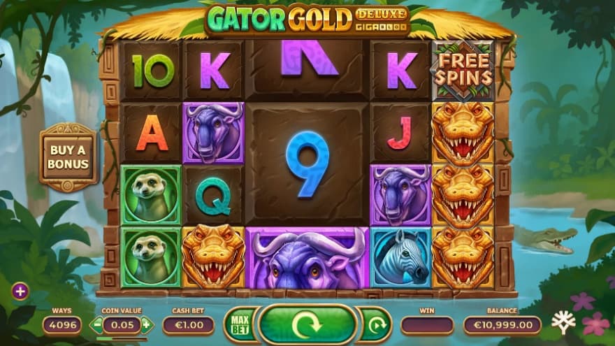 Gator Gold Deluxe Gigablox is a video slot from Yggdrasil that features 6 reels, 4 rows and 4096 ways to win. You can choose to make a Min.bet of 0.20 and a Max.bet of 60. It is an RTP that is slightly below average, where in this slot we have an RTP of 96.00%. Gator Gold Deluxe Gigablox has a hit frequency of 22.80% and a high volatility, where you can win up to 20000X the bet.