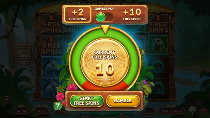 When you activate the Free Spins feature, you can use the Gamble feature. You can then spin a wheel to receive 1 to 3 extra free spins per spin and you can do this until you have received up to 60 free spins. If you land on the red mark, you lose all free spins and return to the base game again.