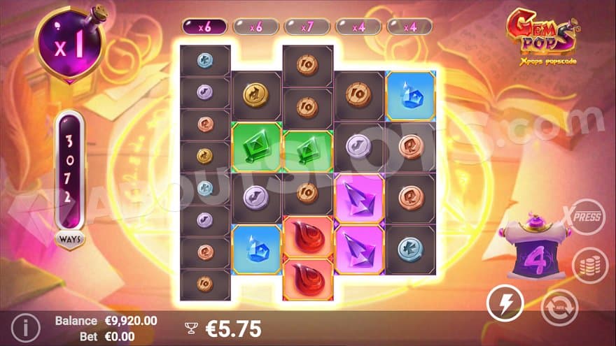 There’s also a sweet Reel Multiplier feature in GemPops, which increases by 1 for every winning symbol on the reel. Whenever a reel reaches its full height, the multiplier is applied to all wins with winning symbols on the reel. In the Free Spins, the Reel Multiplier is added to the total win multiplier that applies to all wins during the entire feature.