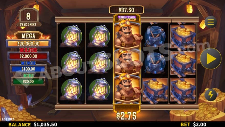The lower-paying symbols include 10, J, Q, K, and A. Five-of-a-kind with one of these symbols will pay 1x-1.5x the bet. The higher-paying symbols consist of a lantern, tools, a wheelbarrow, and a cart of gold. A full line of 5 with one of these pays 2.5x-10x the bet. George himself act as the Wild symbol and can substitute for the paying symbols we just mentioned. Red dynamite act as the Scatter symbol, and a golden ore is the Link&Win symbol. Fittingly, two detonators can trigger the Expanded Reels Feature.