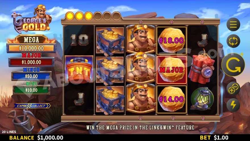 George’s Gold is a new casino slot from Gold Coin Studios where we head down the rails and down a mineshaft, in search of gold, and not anyone’s gold; George’s gold. Gold Coin has picked up some serious pace lately, announcing plenty of up & coming games. We were particularly impressed with Dragon’s Keep, partly because of its exciting mechanics, but mostly because of the great artwork and graphics. The latter was not a one-off, but a trend. Fishing Float of Cash wasn’t as innovative gameplay-wise but was carried by its gorgeous setting. Now, we are aware from the get-go that George’s Gold is a game with the Link&Win feature, so we don’t expect too much innovation, but we are once again hoping for a game with great visuals and animations.
