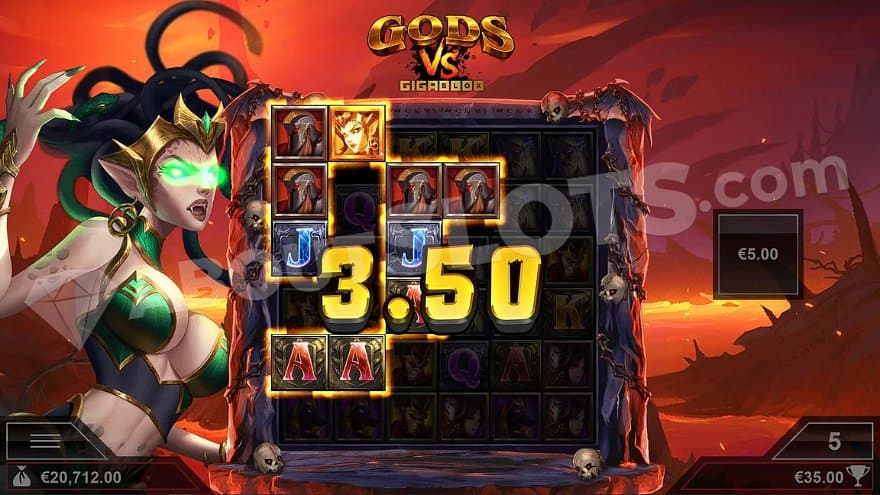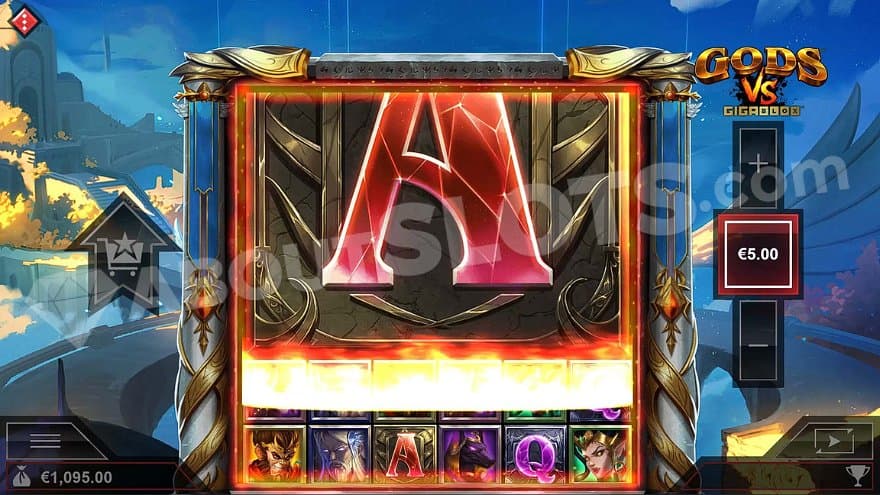 The Versus Battle Free Spins starts when the player has landed the six versus symbols. A champion and a challenger are randomly chosen among the gods before you can start your 6 spins. The champion stands to the left of the reels and the challenger to the right. When their corresponding symbols land, they’re collected to the sides of the reels. Collecting symbols can award extra spins, symbol multipliers, wilds, wilds with multipliers, and major cash prizes. The feature is over when the player runs out of spins.
