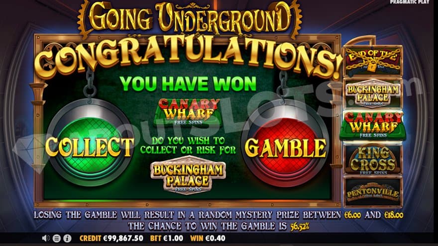 You will see what feature you’re currently at and which one you’re gambling for. If you don’t wish to gamble, you can always play the current bonus game. If you win the gamble, you’ll advance to the next feature. Losing it equals a mystery prize with a value of 4X-24X the bet.