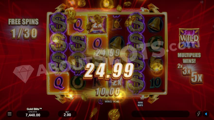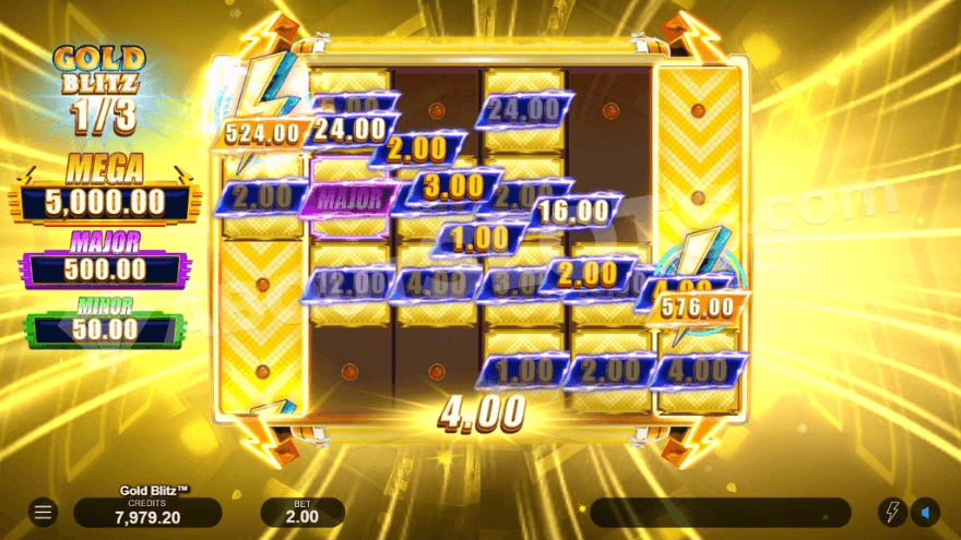 If you choose the Gold Blitz feature after landing 3 Scatter symbols, you are awarded 2 Gold Blitz spins. Additional Scatters award additional spins. During Gold Blitz, at least one Collect symbol will land on each spin. Only Collect, Cash, and Jackpot symbols appear during the feature, and a win is guaranteed on each spin.