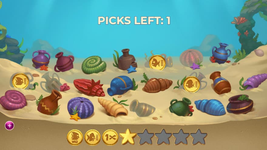 The lower paying symbols consist of the suit’s diamonds, clubs, spades and hearts. If you land 6 of the same symbol type, it gives 2X the bet. The higher paying symbols consist of four different fishes in the colors purple, blue, white and green. If you land 6 of the same symbol type, it gives between 6X to 12X the bet. The game's scatter symbol consists of a goldfish with the text free spins and the wild symbol shows a symbol with the text wild, where during the free spins you can activate other wild symbols that show a goldfish. The absolute highest paying symbol is this wild and if you land 6 it gives 20X the bet. A new symbol introduced within this slot is the bonus chest symbol. Several other symbols containing exciting features will be at the bottom of the aquarium within the free spins feature, which, as in the previous version, you will be able to choose from. Let's find out what the features do.