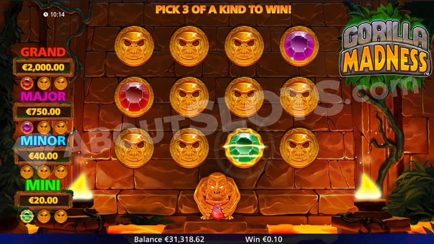 The Gorilla Madness Jackpot can trigger anytime when a Wild Symbol appears. The feature starts with a screen containing 12 coins, and the player gets to pick one at a time. Behind each coin is one of the Jackpots Mini, Minor, Major, or Grand. They are worth 22.73X, 45.45X, 852.27X, and 2272.73X the bet. The first Jackpot to appear 3 times will be awarded to the player, and the feature is over.