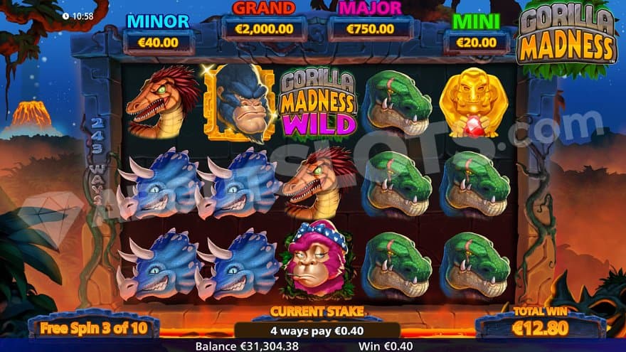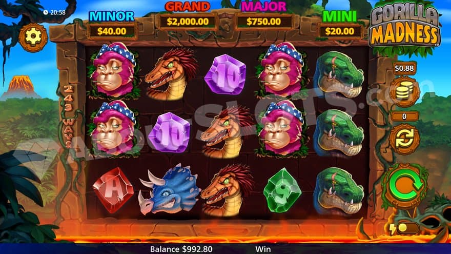 Gorilla Madness is a new casino slot from Light & Wonder with a frightening alpha gorilla and his pink-haired lady gorilla. The plant-eating beast can weigh almost 300 kg, and his mission in Gorilla Madness is to help the player create big wins. You will also find a couple of dinosaurs and a dragon-looking creature in a lush tropical landscape where hot volcano lava flows beneath the reels. The game has 243 ways to win, awarding wins as long as the symbols are on adjacent reels, and the free spins improve the chances of winning drastically by removing the lower-paying symbols. On top of that is a Jackpot game that can award the max win of 2273X the bet.