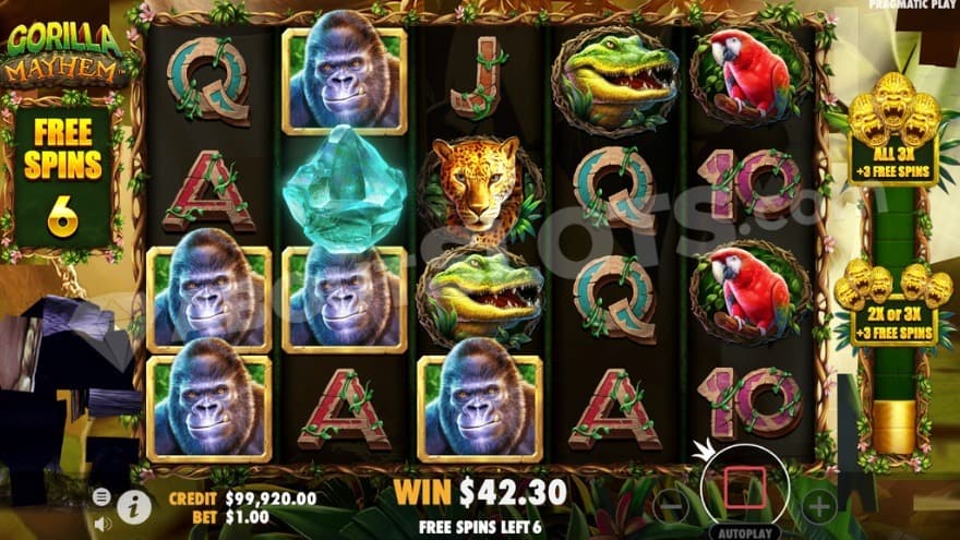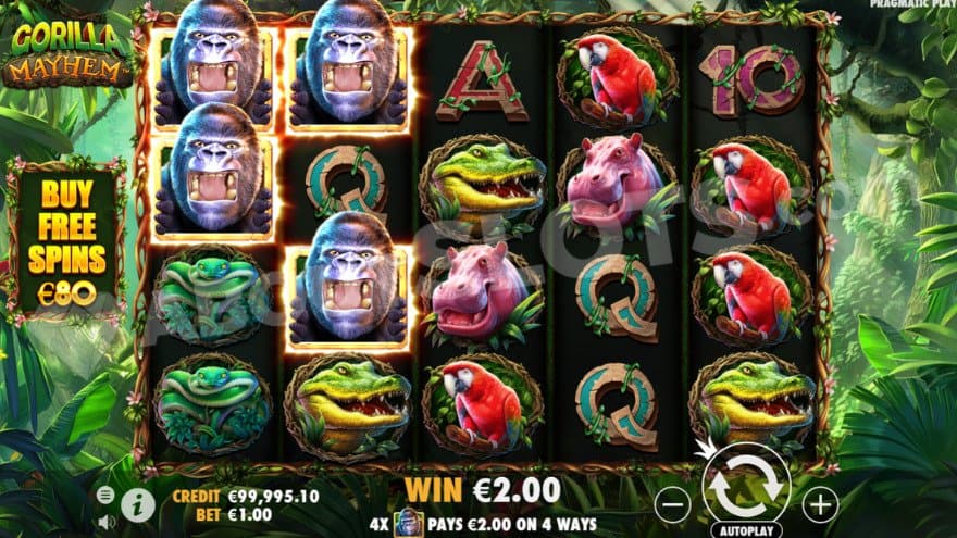 Gorilla Mayhem is a new casino slot from Pragmatic Play full of wild African animals. Apart from gorillas are leopards, crocodiles, and hippos on the run. The hippopotamus is the African animal that kills most humans every year, about 3000. Actually, the mosquito is more lethal considering all the diseases it spreads – but that little fellow isn’t present in Gorilla Mayhem. You’ll also find golden screaming gorillas, multiplying wins up to 3X the bet, and a free spins session with 3 levels.