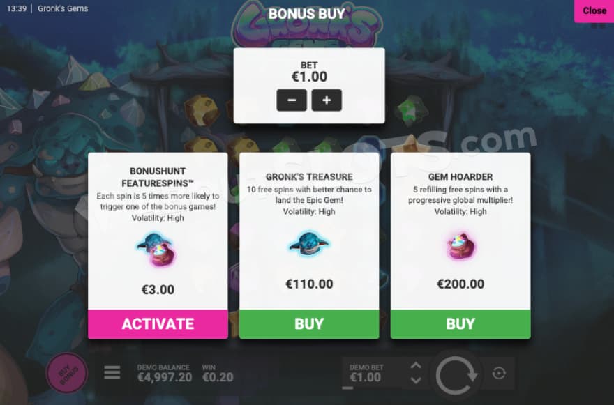 Within this gaming adventure that takes place alongside a giant troll, we have a couple of great features to help us in our quest for the bigger wins. The features are Cascade, Wild Symbol, Charged Symbols & Epic Gem, Gronk's Treasure, Gem Hoarder and Bonus Buy.