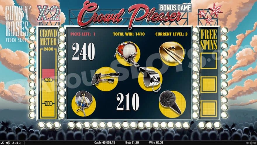 The Crowd-Pleaser is a pick & click bonus game in 3 levels. You get 3 picks that can award cash prizes in Coin Win, Free Spins Symbols, and +1 Pick Symbols. Picking a total of 3 Free Spin Symbols, one on each level, will award 10 free spins.