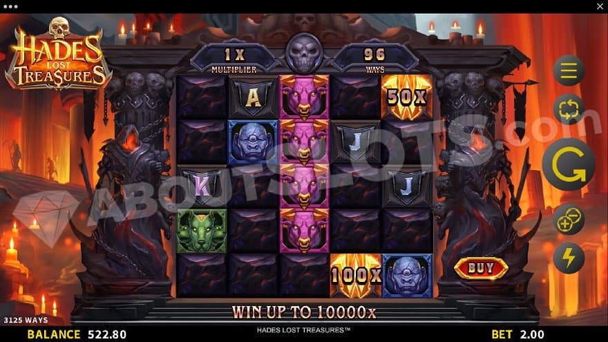 Hades Lost Treasures is a video slot from Gold Coin Studios with 5 reels and 5 rows. Random blocker symbols appear on the reels, and with no blockers, you will have 3,125 ways to win. The Min.bet is 0.2, and the Max.bet is capped at 25. The RTP is 96.23%, and the volatility is high. Hades Lost Treasures has a max win of 5,000X the bet and a hit frequency of 27.7%, which award wins on more than every fourth spin.