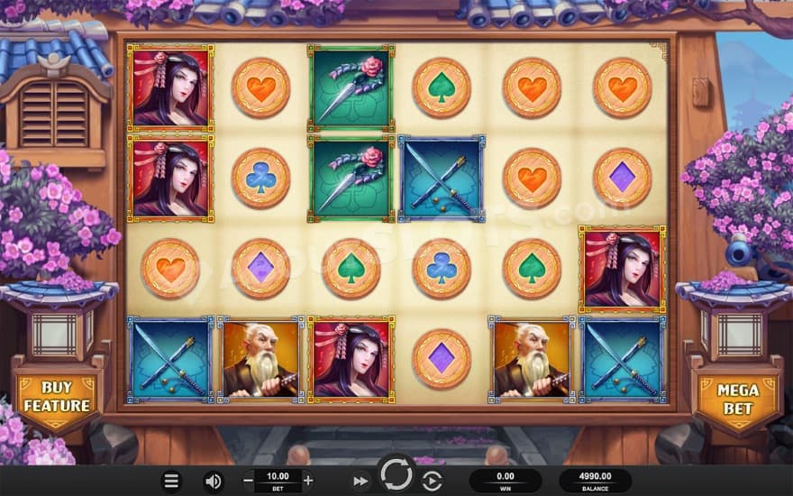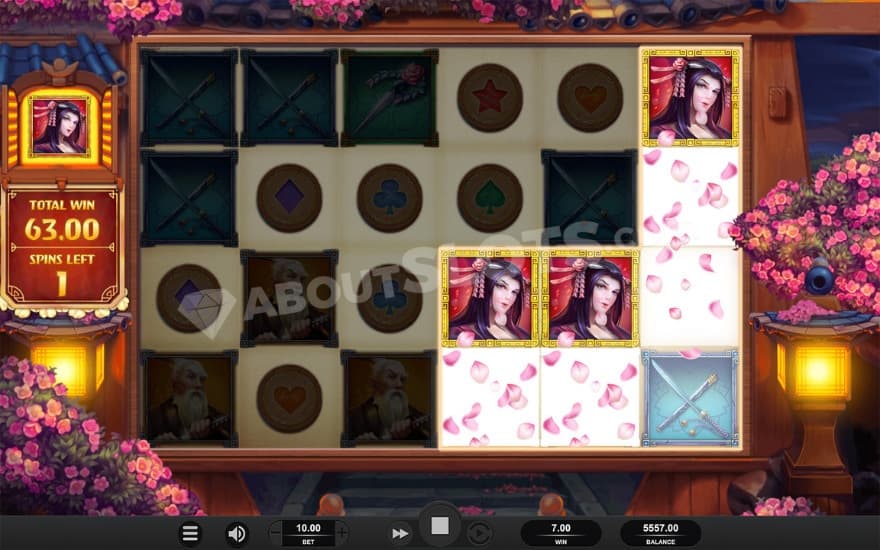 The lower paying symbols are diamonds, clubs, spades, hearts and stars. Landing 6 of the same symbol type pays between 1X to 2X the bet. The higher paying symbols are a samurai sword, a dagger decorated with a rose, a samurai ready to draw his sword and the fortune seeking girl. If you land 6 of the same symbol type, it pays between 3X to 50X the bet. The game's wild symbol consists of a full blooming flower with the word wild on it and the scatter symbol consists of a sky lantern. Let's find out what the features do.