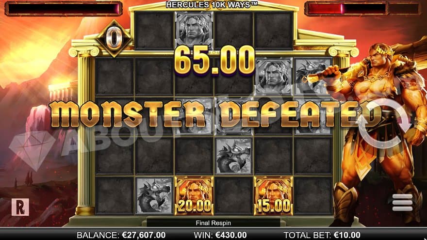 When the spins are finished, the symbols are processed from left to right and top to bottom. Every monster symbol reduces Hercules’ life points by 1, and every Hercules symbol reduces the opponent’s life points by 1 and awards the displayed prize. If Hercules’ life reaches 0 before symbol processing is complete, it stops, and the battle feature is over.