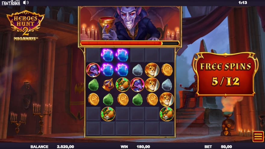 If you land 1 or more of the explosion symbols (orb), you get to experience the Explosion feature. This symbol can land within the Vampire free spins or on the reels 2-5 if you have unlocked the Wizard hero. What then happens is that 1 or 2 2X2 adjacent areas to the explosion symbol will disappear or there will be a 3X3 around this explosion symbol. The same type of symbol will then be displayed on the positions that were blown away, like a mystery symbol. When it explodes, blocker symbols and non-winning symbols can be removed.